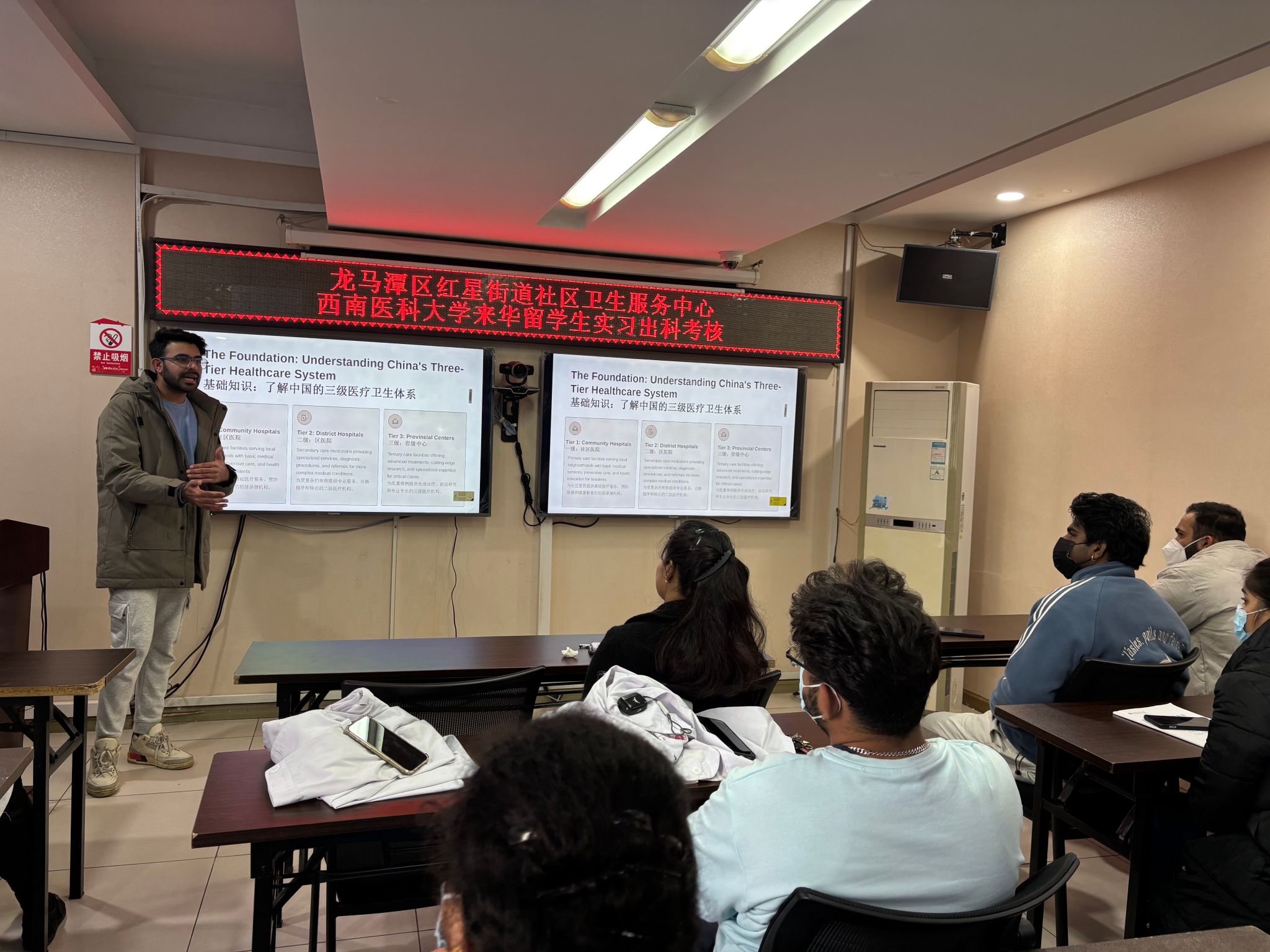 2月1日,我校临床医学专业来华留学生在泸州市龙马潭区红星街道社区卫生服务中心,顺利完成为期两周的基层医疗实习,通过分组述职与出科考核,圆满结束此次实践学习。