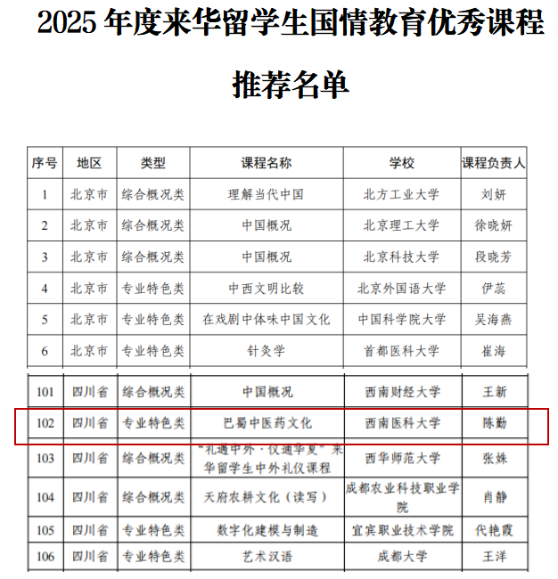 近日,受教育部国际合作与交流司委托,中国教育国际交流协会发布了2025年度来华留学生国情教育优秀课程评选结果。我校《巴蜀中医药文化》课程成功入选(四川省共6门)。这是我校首次入选教育部来华留学国情教育课程,体现了学校在来华留学生国情教育方面的国家级突破。