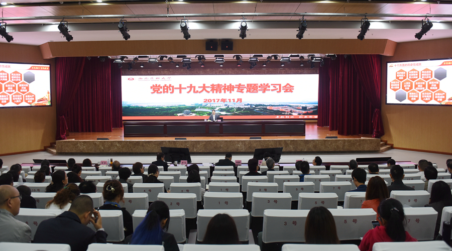 会上,党委书记廖斌以“以党的十九大精神为指导 奋力开启学校事业发展新征程”为题作了专题辅导报告。报告中,廖斌从党的十九大概况、十九大报告的重点解读、对教育领域和医疗卫生领域的新要求、对党建工作的新思路、新党章的修改要点、以新时代中国特色社会主义思想统领学校事业发展等六个方面传达、解读了党的十九大精神,并就全校学习宣传贯彻党的十九大精神作了安排部署。
