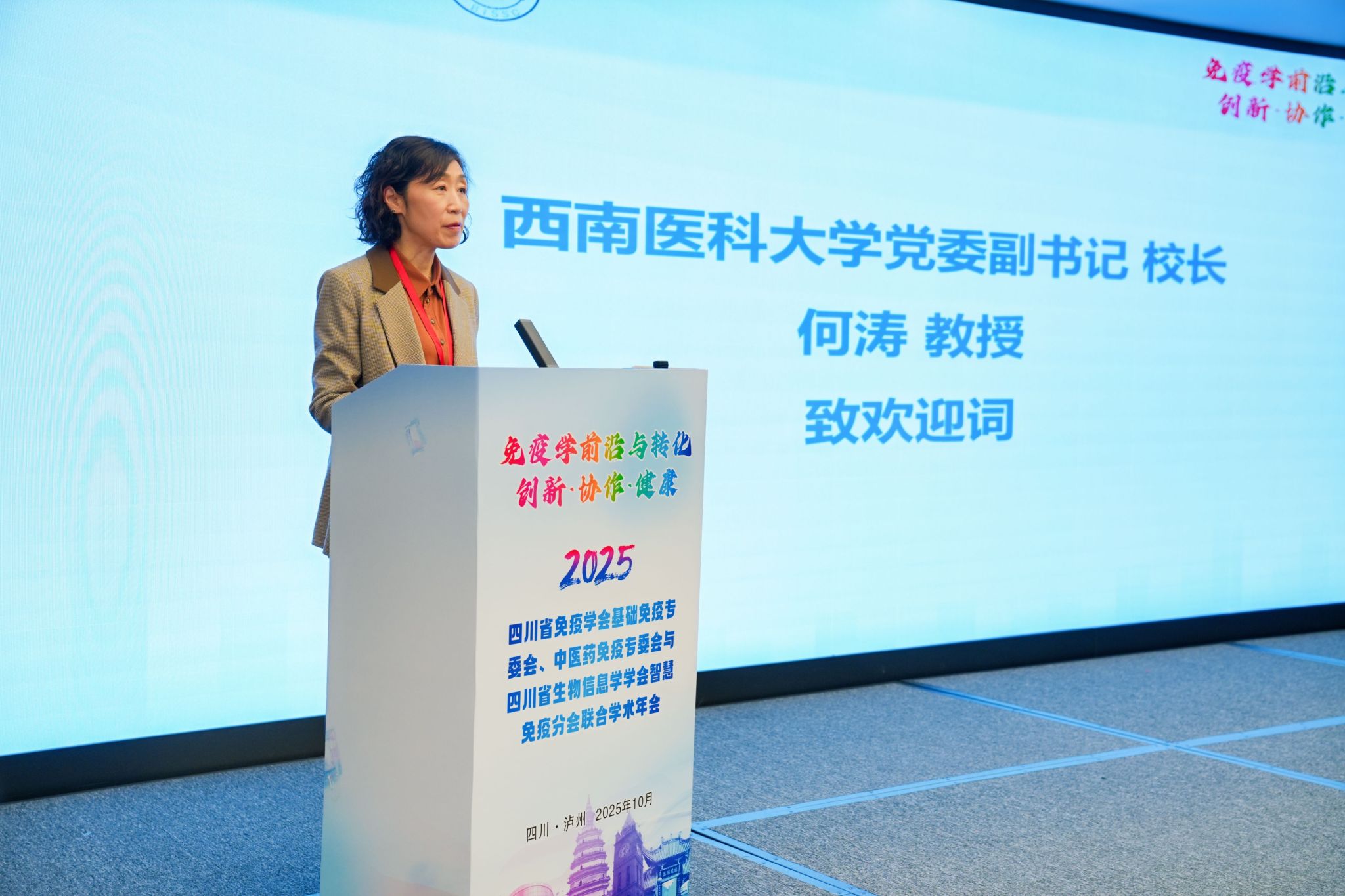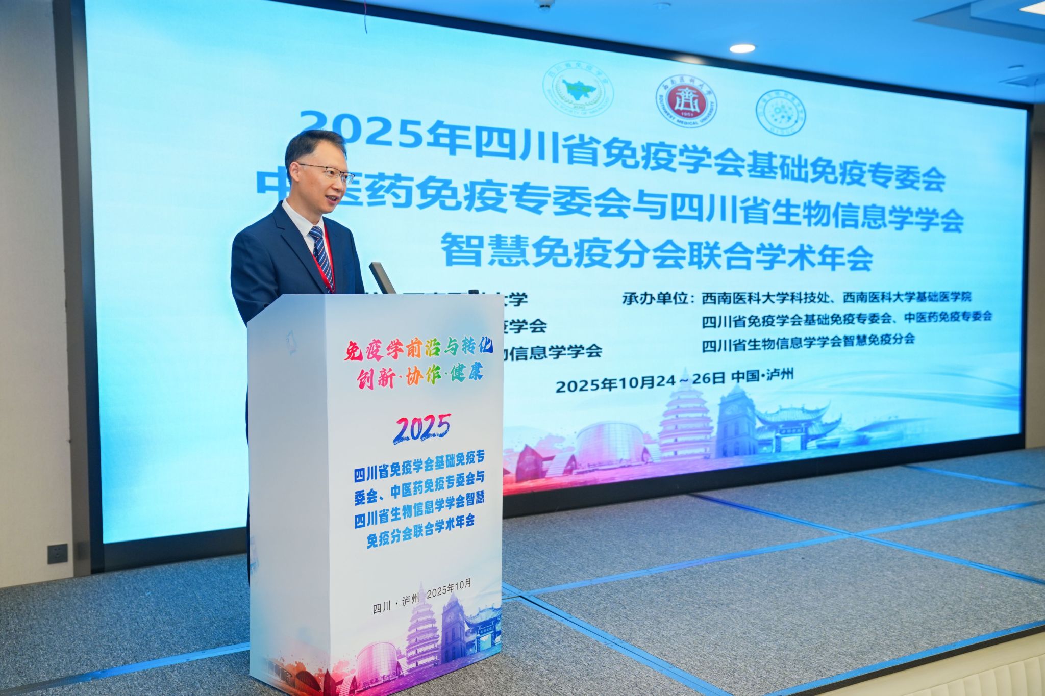 1025日,由西南医科大学、四川省免疫学会、四川省生物信息学学会共同主办的“2025年四川省免疫学会基础免疫专委会、中医药免疫专委会与四川省生物信息学学会智慧免疫分会联合学术年会在我校学术交流中心(泸州酒城豪生酒店)成功举办。学校党委副书记、校长何涛出席开幕式并致辞,科技处处长吴建明主持开幕式。约200位来自省内外高等院校、科研院所及医疗机构的免疫学、生物信息学及相关领域的专家学者与技术骨干参会。
