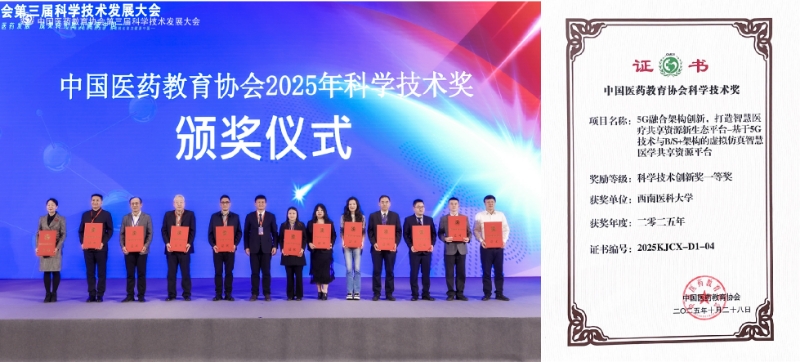 西南医科大学党委副书记、校长何涛,医学信息与工程学院学术院长娄岩,科教科科长康晓宇代表学校参会,并现场接受颁奖。我校获奖团队成员包括:娄岩、何涛、罗亚梅、钟丽莎、周赟、张果、单东晶、康晓宇。该项目围绕国家智慧医疗与医学教育数字化发展战略,依托5G技术优势,创新性构建了“5G+虚拟仿真+智慧医学”融合生态,通过B/S架构实现跨设备、跨地域、跨院校的医学教育教学与临床实训资源共享。平台集虚拟仿真实训、远程教学、医疗资源共建共享、智能交互体验等功能于一体,解决传统医学实验教学资源不足、临床实训机会有限、优质教育资源分布不均等问题。