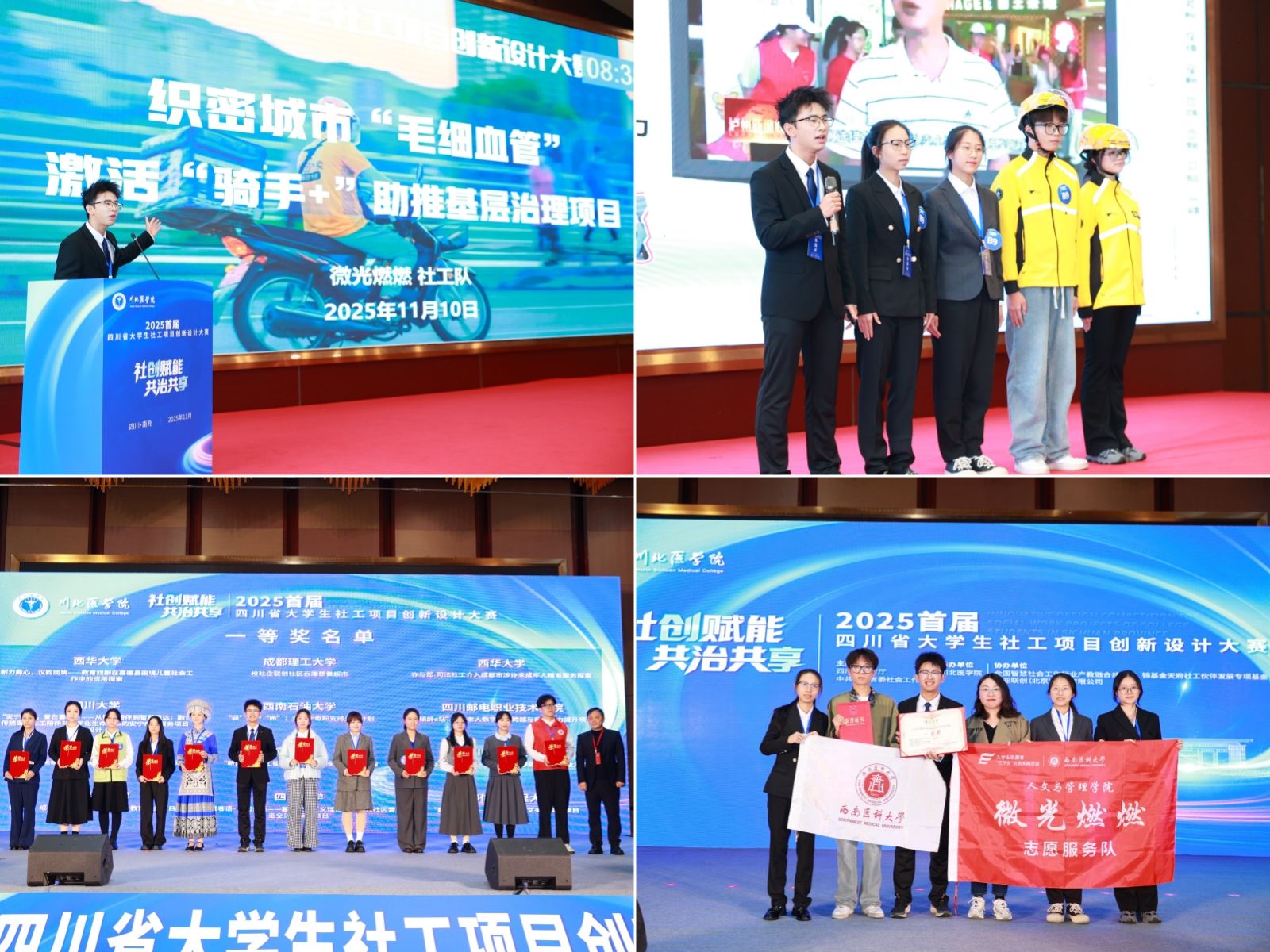 1110日,由四川省教育厅、中共四川省委社会工作部联合主办的社创赋能·共治共享2025年四川省大学生社工项目创新设计大赛决赛在川北医学院圆满落幕。人文与管理学院微光燃燃团队凭借项目《织密城市毛细血管”——激活骑手+”助推基层治理》,以全场最高分的优异成绩荣获大赛一等奖,公共事业管理专业教研室温艳青、孙雪两位老师获评优秀指导教师