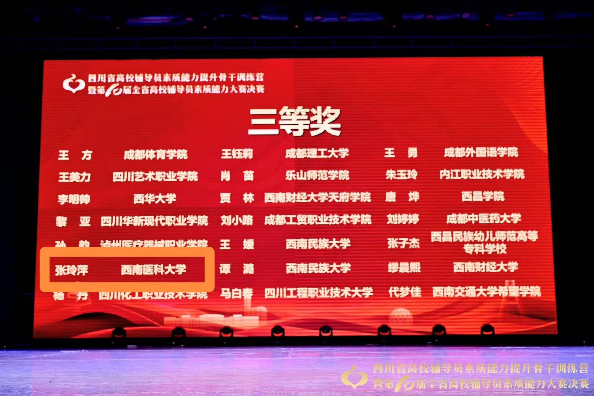 1114日至16日,由中共四川省委教育工委、四川省教育厅主办的四川省高校辅导员素质能力提升骨干训练营暨第十届全省高校辅导员素质能力大赛决赛在西华大学举行。来自全省125所高校的166名优秀辅导员开展激烈角逐,我校儿科学系张玲萍荣获大赛三等奖,基础医学院杨笛荣获大赛优秀奖。