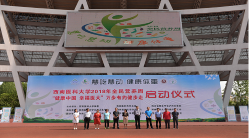 5月13日上午,西南医科大学2018年“全民营养周”暨“健康中国 幸福医大”万步有约健步走活动启动仪式在奥体中心举行。活动由西南医科大学体委、工会和四川省营养学会泸州办事处主办,西南医科大学公共卫生学院、体育学院、教辅后勤工会承办。学校党委副书记刘毅、党委办公主任林普、校长办公室主任代天祥、党委宣传部部长柏珂、学生工作部部长张碧国、学校工会副主席陈先红、公共卫生学院院长贾红、体育学院党总支书记孔晓明、校团委副书记刘玲爽、泸州市营养协会秘书长贾国泰以及师生、社区代表参加了启动仪式。