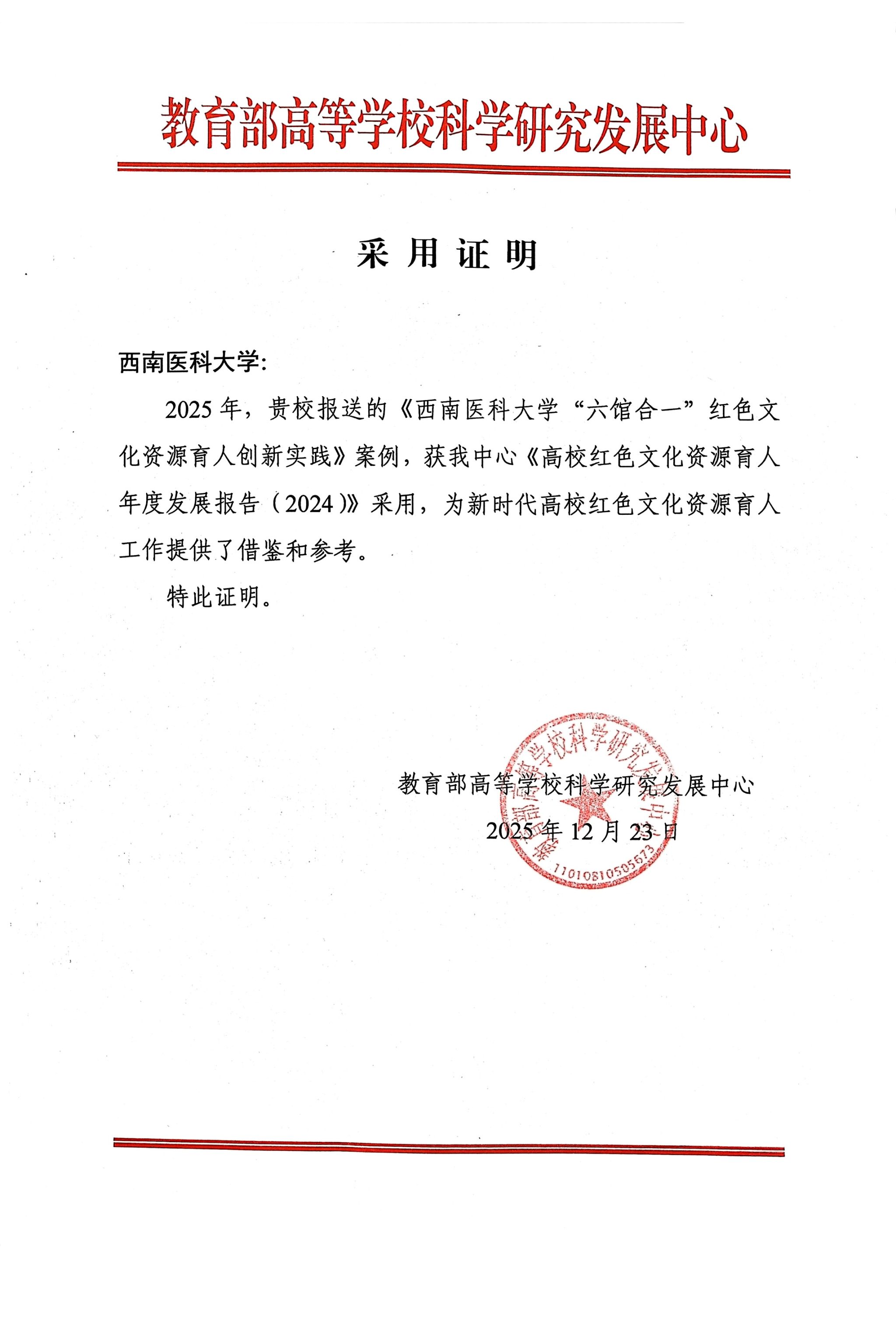 近日,我校报送的案例《西南医科大学“六馆合一”红色文化资源育人创新实践》,被教育部高等学校科学研究发展中心《高校红色文化资源育人年度发展报告(2024)》采用。