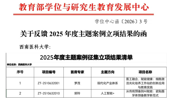2月13日,教育部学位与研究生教育发展中心(以下简称“教育部学位中心”)正式公布2025年度主题案例立项结果。我校研究生院罗茂教授领衔申报的《医工融合,赋能健康:细胞激活光化培养工作站的创新应用与教育实践》案例和口腔医学院郭玲教授领衔申报的《从传统预备到AI赋能:瓷贴面牙体预备教学新范式》案例获批立项。