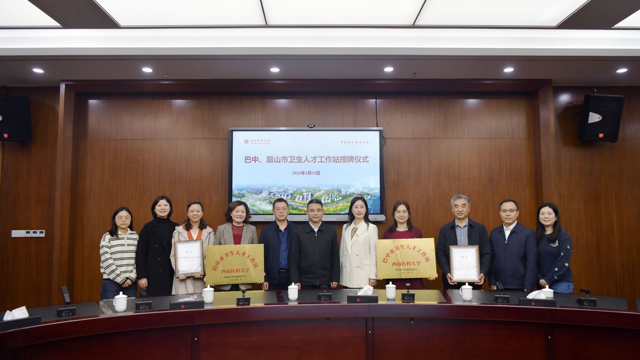同日下午,在城北校区一会议室,举行了巴中市、眉山市卫生人才工作站授牌仪式。学校党委副书记蒋通荣、巴中市卫健委副主任胥菊华、眉山市卫健委四级调研员李君明以及相关人员共11人参加。该校地共建卫生人才工作站机制,将有力加强当地卫生健康人才队伍建设,促进学校毕业生高质量充分就业。
