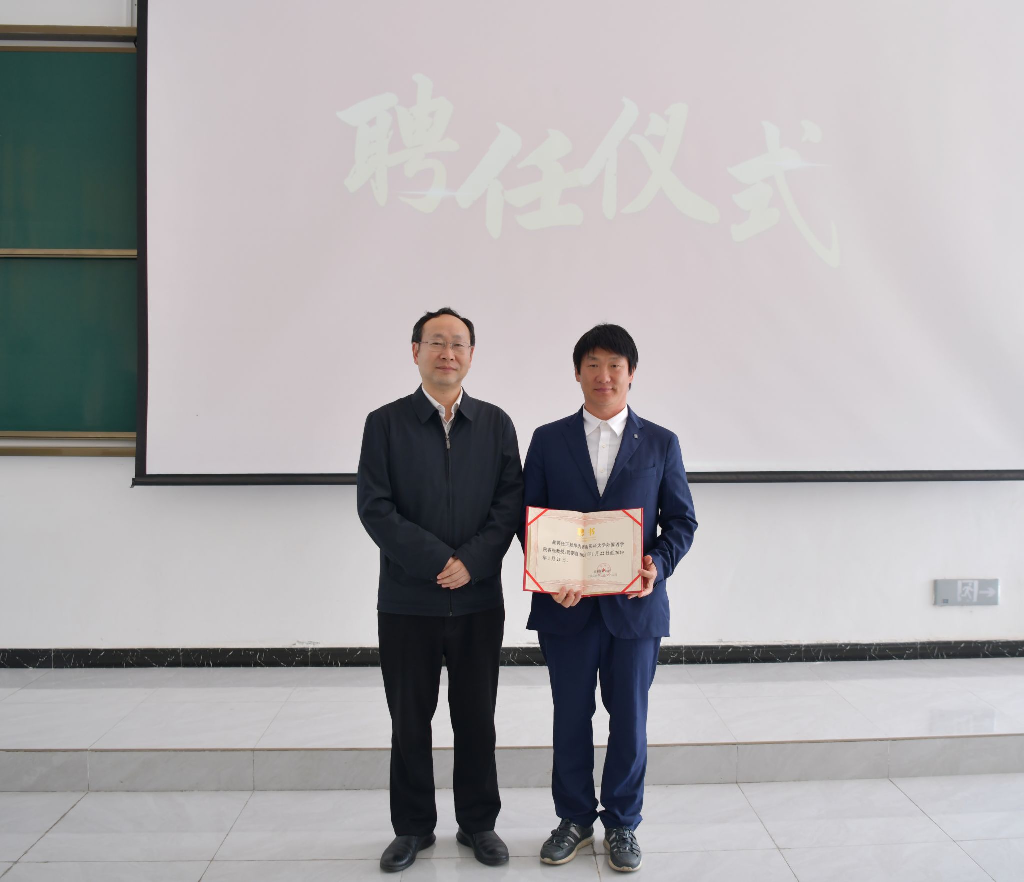 4月9日下午,外国语学院在城北校区第三学术报告厅举行王廷华客座教授聘任仪式暨“廷华基金”捐赠仪式及实习基地签约仪式。学校党委常委、副校长聂敏海出席仪式,四川大学华西医院神经疾病研究室主任、昆明医科大学神经科学研究所所长王廷华教授、人事处副处长李理、对外联络处负责人陶瑞宇、外国语学院处科级干部、教研室(实验室、中心)主任、党支部书记及师生代表参加仪式。仪式由外国语学院党委副书记、纪委书记邓盛木主持。