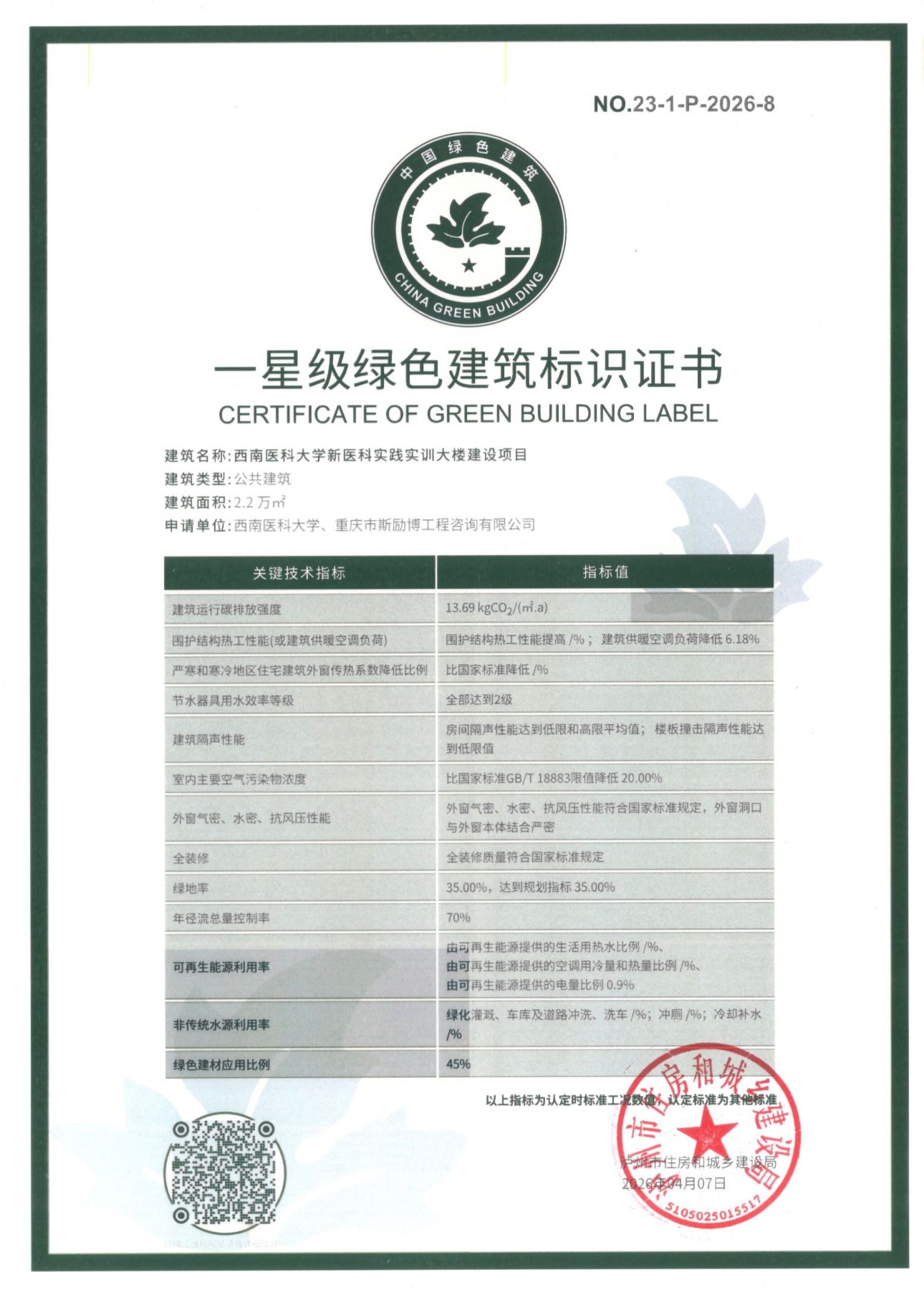 4月7日,我校新医科实践实训大楼正式通过一星级绿色建筑标识认定,获得由泸州市住房和城乡建设局颁发的标识证书。