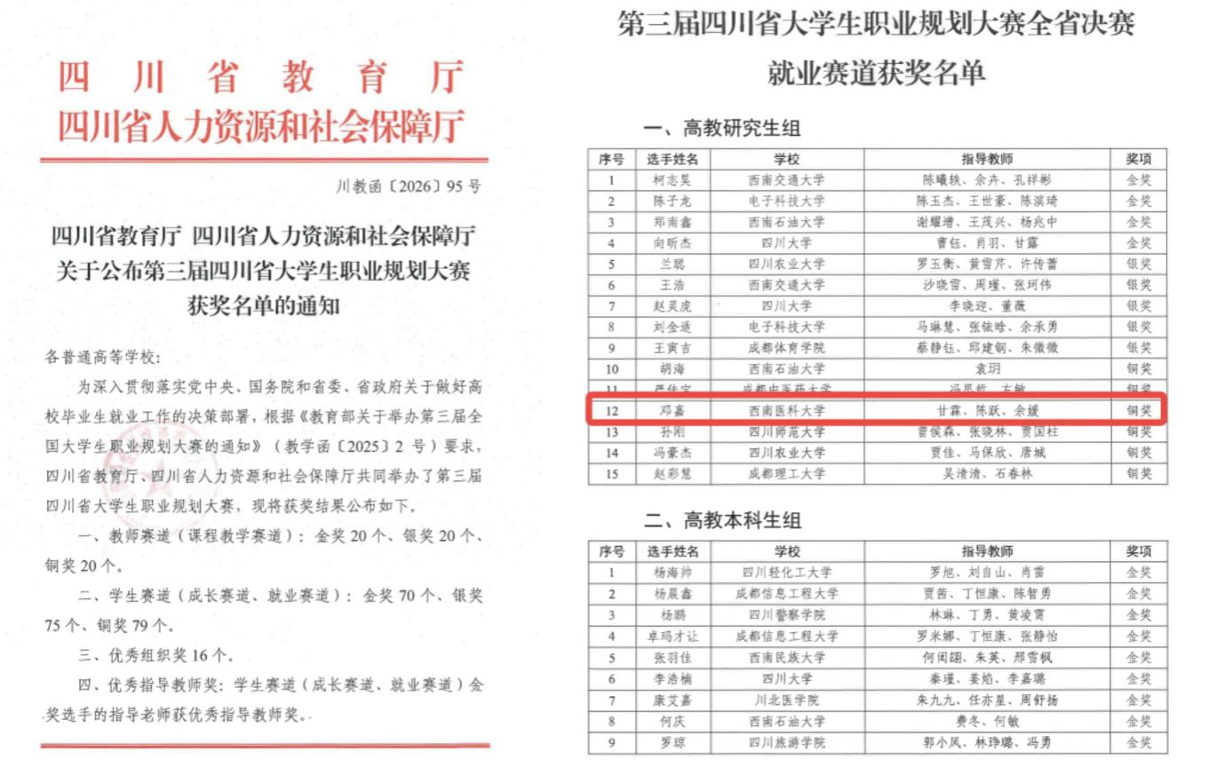 此次获奖,不仅是邓嘉同学个人努力的成果,更是学校深化职业生涯教育、提升人才培养质量的生动体现。下一步,西南医科大学党委研究生工作部将以此次大赛为契机,持续践行“以赛促学、以赛促教、以赛促就”理念,不断完善就业指导服务体系,优化职业生涯教育举措,引导广大学子树立正确的择业观、就业观,科学规划职业发展路径,提升就业核心竞争力,推进学校就业工作更上新台阶。