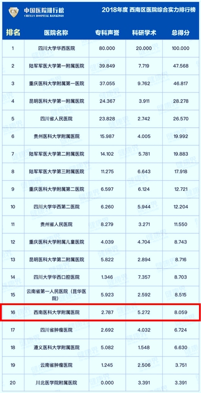 附属医院在2018年西南区医院综合实力排行榜上排名第16名,较去年总排名17名提升1名。科研学术综合评分排名第9名。附属医院核医学科再次进入全国专科声誉榜提名并在西南区医院专科声誉排名榜上排第二名。