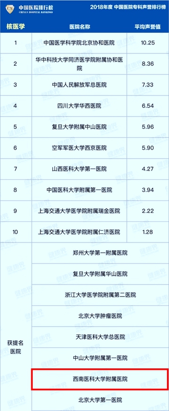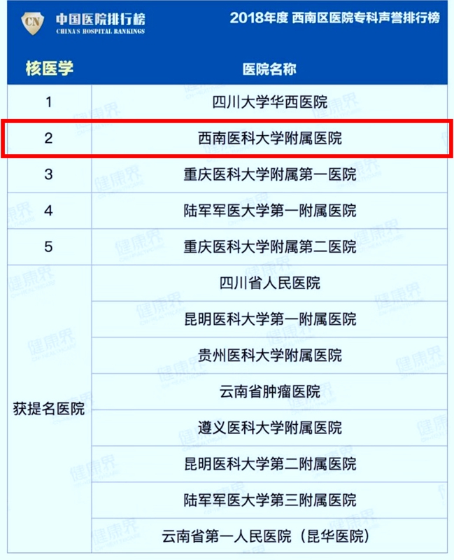 附属医院核医学科再次入围全国专科声誉榜提名并连续第5年荣登复旦版“中国医院专科声誉排行榜”西南区第二名。