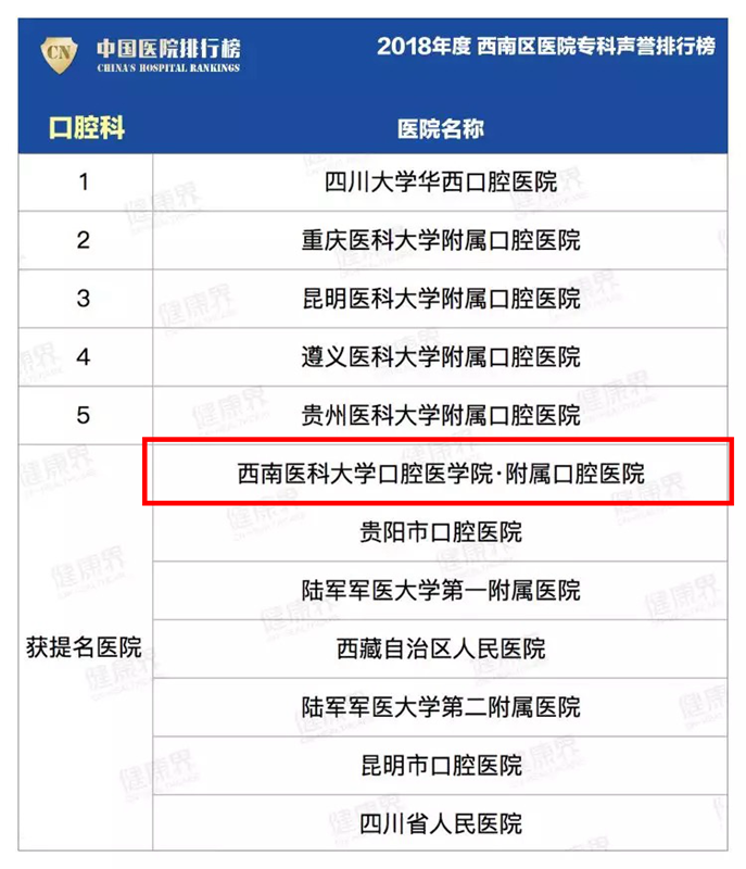 附属口腔医院口腔科获西南区医院专科声誉排行榜提名。