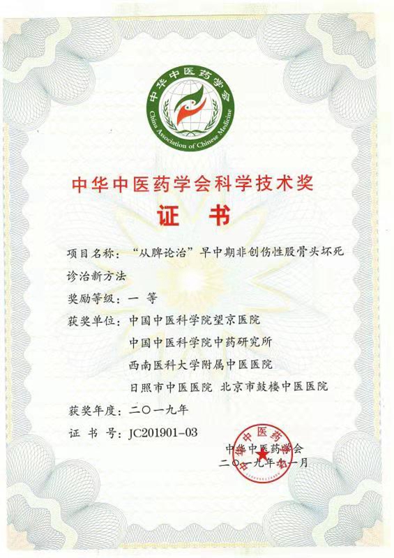 1114日,2019年度中华中医药学会科技成果、优秀人才奖颁奖典礼在北京举行。由中国中医科学院望京医院、中国中医科学院中药研究所、西南医科大学附属中医医院、日照市中医医院、北京市鼓楼中医医院联合申报的科研项目《“从脾论治”早中期非创伤性股骨头坏死诊治新方法》荣获中华中医药学会科学技术奖一等奖。