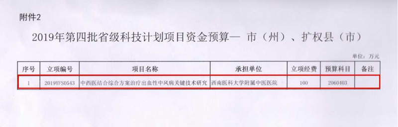 日前,四川省财政厅、四川省科学技术厅联合公布了2019年第四批省级科技计划项目,附属中医医院心脑血管研究中心团队的研究项目《中西医结合综合方案治疗出血性中风病关键技术研究》获四川省科技厅100万重大项目立项资助。