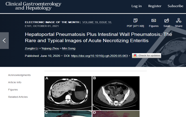 近日,胃肠病学顶级期刊、美国胃肠病学会(American Gastroenterological Association)官方临床实践杂志Clinical Gastroenterology and HepatologyIF: 11.382)发表了临床医学院·附属医院胃肠外科李宗林等医生撰写的学术论文Hepatoportal pneumatosis plus intestinal wall pneumatosis: the rare and typical images of acute necrotizing enteritis