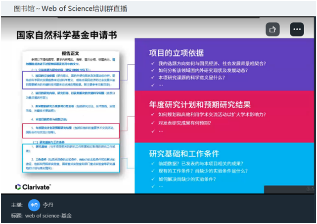 本次培训邀请了科睿唯安学术研究事业部专家李丹博士,作了“Web of Science在基金选题与申请书撰写中的应用”的专题培训讲座。内容围绕基金选题与申请书撰写,以Web of Science平台为科研人员提供多学科、多类型的数据资源为核心,结合Essential Science Indicators基础科学指标和Research Fronts研究前沿;从有基础的研究方向、项目指南、研究前沿与热点、国民经济以及社会发展背景等方面对基金选题和申报书撰写进行了较为全面的讲解,为我校科研人员基金选题和申报书撰写提供新的视野和方法。