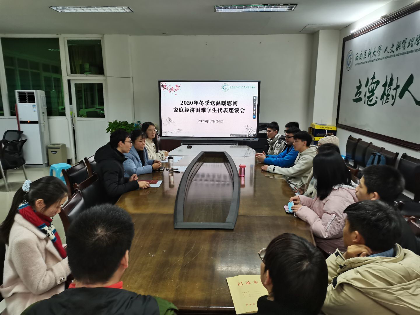 近日,人文与管理学院2020年“冬季送温暖”慰问家庭经济困难学生代表座谈会在学院会议室举行。会议由人文与管理学院学生科副科长陈旭主持,学院党总支副书记马俊、辅导员陶丽娜及12名家庭经济困难学生代表参加了座谈会。