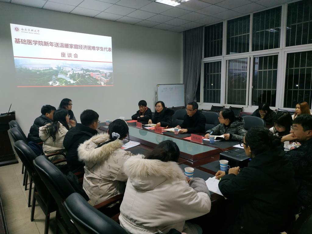 12月29日晚,基础医学院新年送温暖家庭经济困难学生代表座谈会在学院小会议室举行。会议由基础医学学生工作办公室副主任王旭利主持,学生工作部副部长崔继东、基础医学院党委副书记黄钰、资助管理中心副主任胡艳秋、基础医学院各学生工作办公室负责人、全体辅导员及10名家庭经济困难学生代表参会。