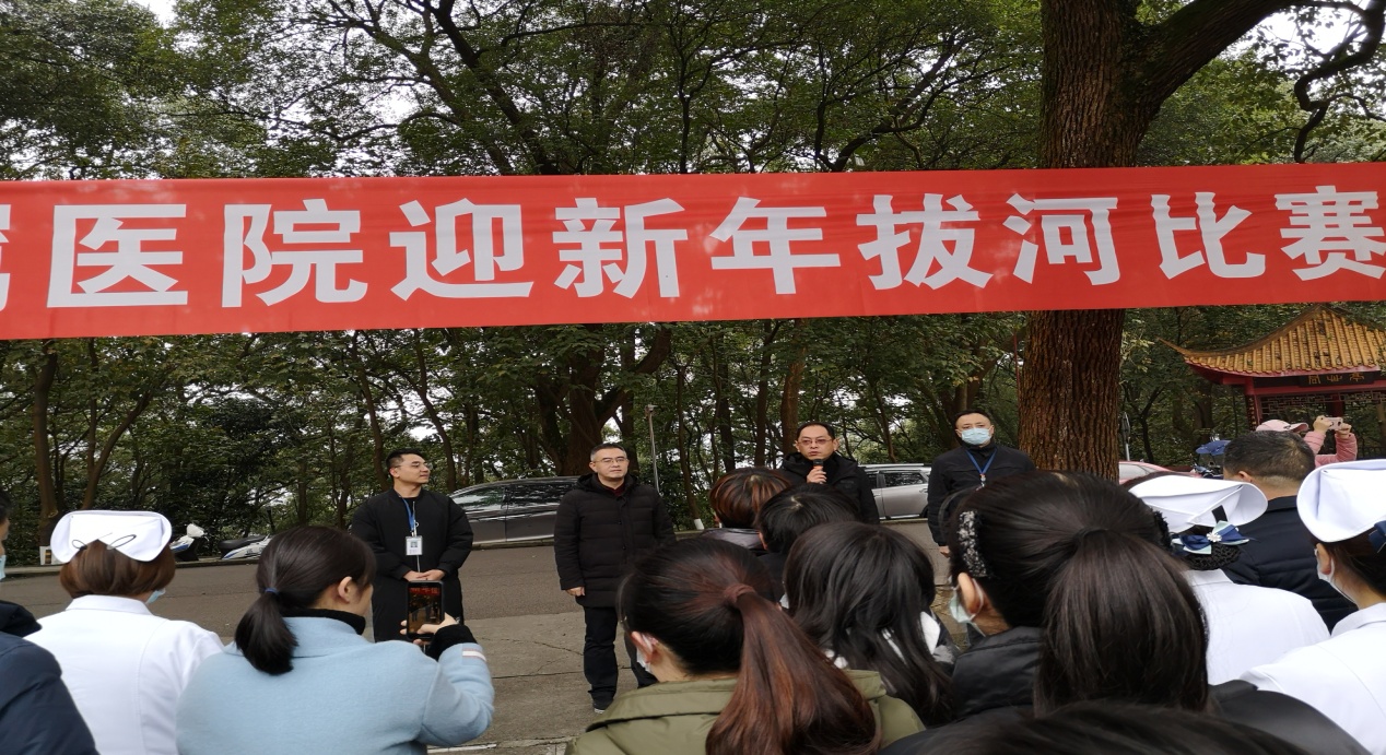 “一根绳一条心,拼尽全力,劲朝一处使,形成一股强大的力量,团结必胜”,2021年元旦节来临前夕,为丰富职工业余文化生活,增进团结协作精神,12月30日下午,附属医院工会组织十九个分工会团队在西南医科大学忠山校区操场举行了“西南医科大学附属医院迎新年拔河比赛”,比赛由医院党委副书记•工会主席黎靖主持。