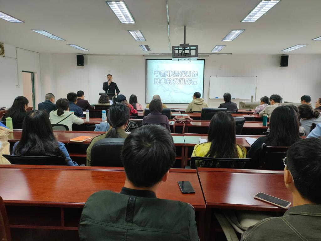 殷亚林带领在座师生从中西方戏曲的对比中认识昆曲的综合性、从历史的纵向维度上介绍了昆曲在南曲体系中的发展及兴盛,结合《白蛇传》《浣纱记》《牡丹亭》等传世名作向师生们展示了昆曲丰富多彩的魅力。