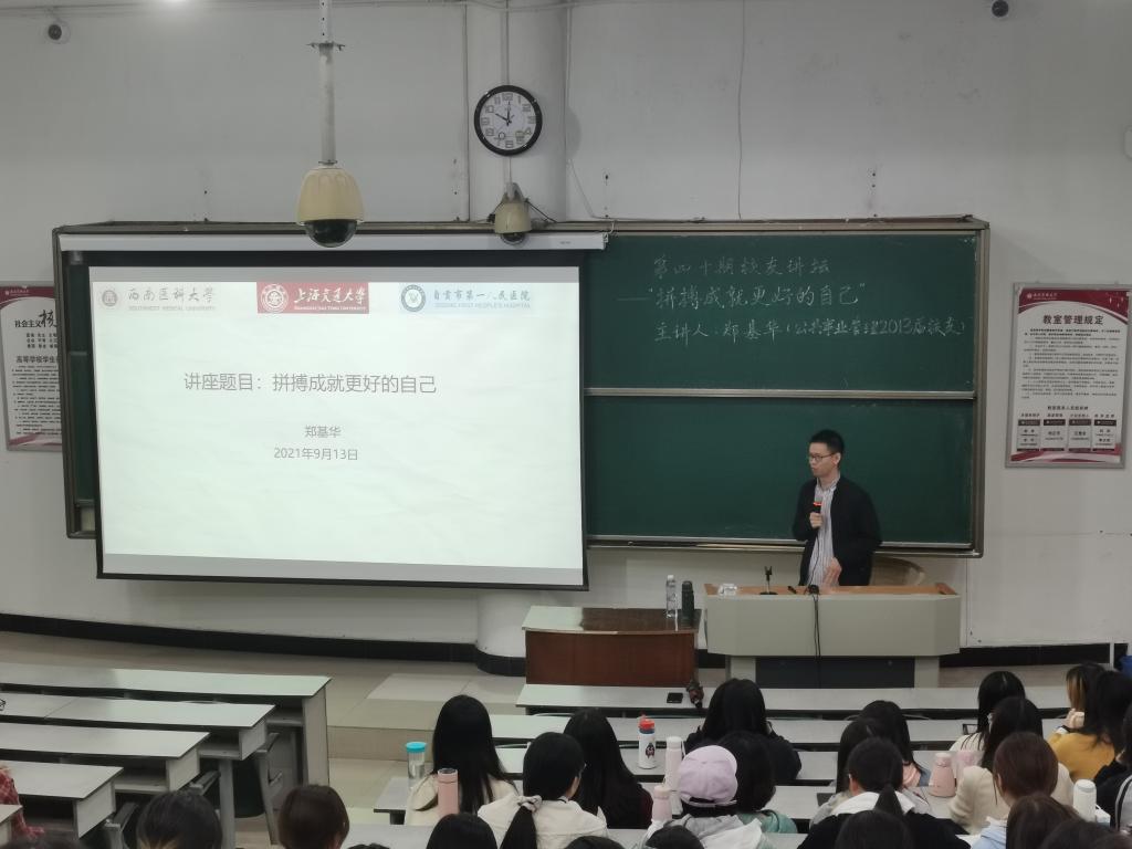 10月13日,由西南医科大学对外联络处和人文与管理学院联合主办的第四十期校友讲坛在西南医科大学城北校区荟文楼101教室举行。本次校友讲坛邀请了2009级公共事业管理专业毕业生郑基华为同学们开展了主题为“拼搏成就更好的自己”的讲座分享,人文与管理学院公共事业管理教研室主任黄宵、学生科副科长陈旭、辅导员陶丽娜及2018级、2019级、2020级公共事业管理专业的200余名同学参加了讲坛。讲坛由黄宵主持。