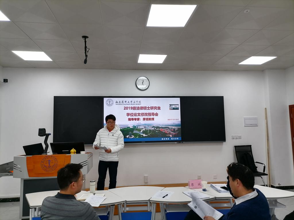 12月23日上午,法学院在文渊楼518室召开2019级法律硕士研究生学位论文写作指导会。由法学院兼职教授廖斌指导2019级法律硕士研究生的学位论文修改,学院22名法律硕士研究生通过“线上+线下”的方式接受了本次指导,会议由法学院分管研究生工作副院长先德奇主持。