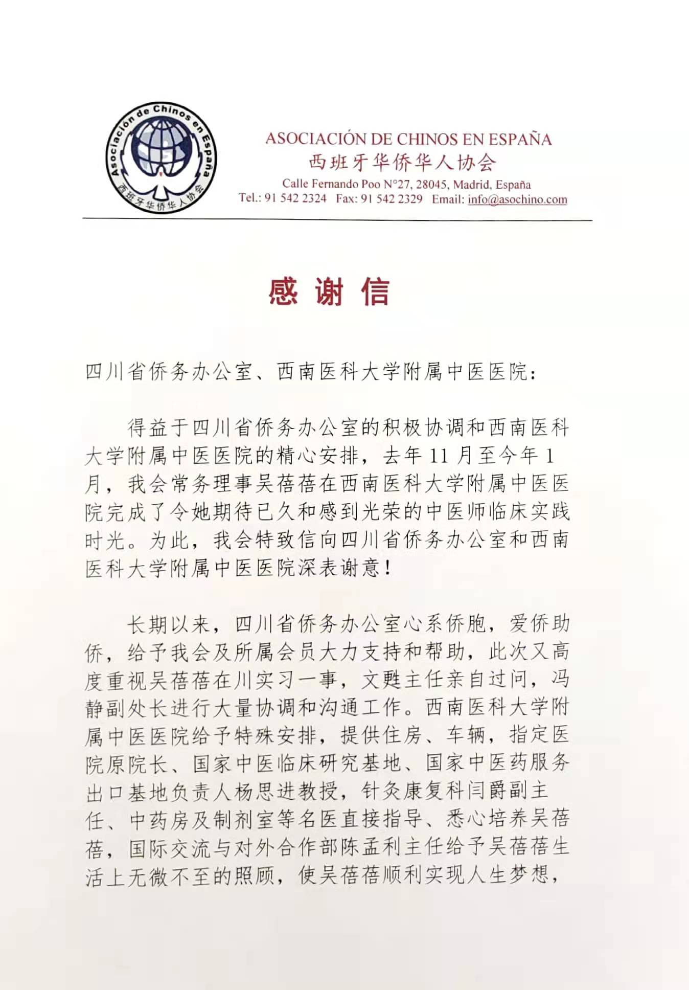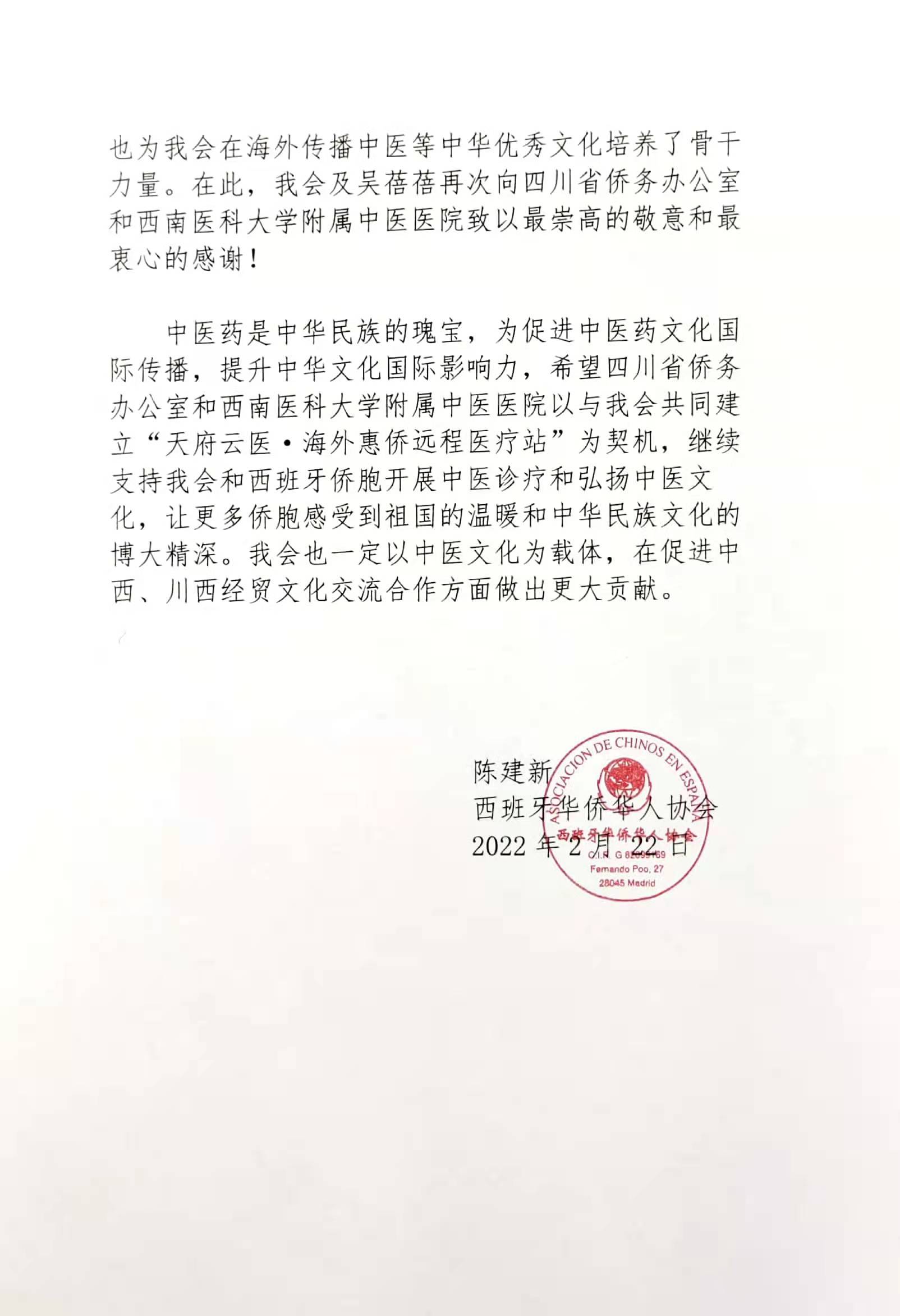 2022年2月25日,西班牙华侨华人协会向西南医科大学附属中医医院发来感谢信,对西南医科大学附属中医医院为西班牙华侨吴蓓蓓提供中医临床实习机会以及实习期间无微不至的关心与照顾表示感谢。同时,对西南医科大学附属中医医院为其在海外传播中医等中华优秀文化培养骨干力量表达了崇高的敬意。