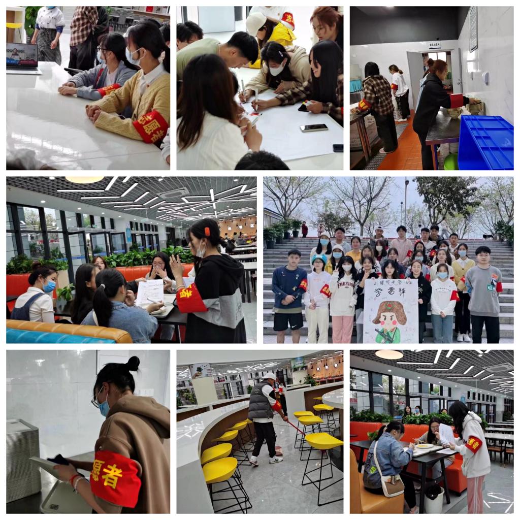 同学们穿戴好志愿者服务袖徽章,一同观看了“弘扬雷锋精神宣传片”等视频后,有序分组在兰香苑三个楼层分别帮助工作人员清扫大堂卫生、协助后厨洗碗、完成调查问卷填写、参与维护食堂秩序等活动。
