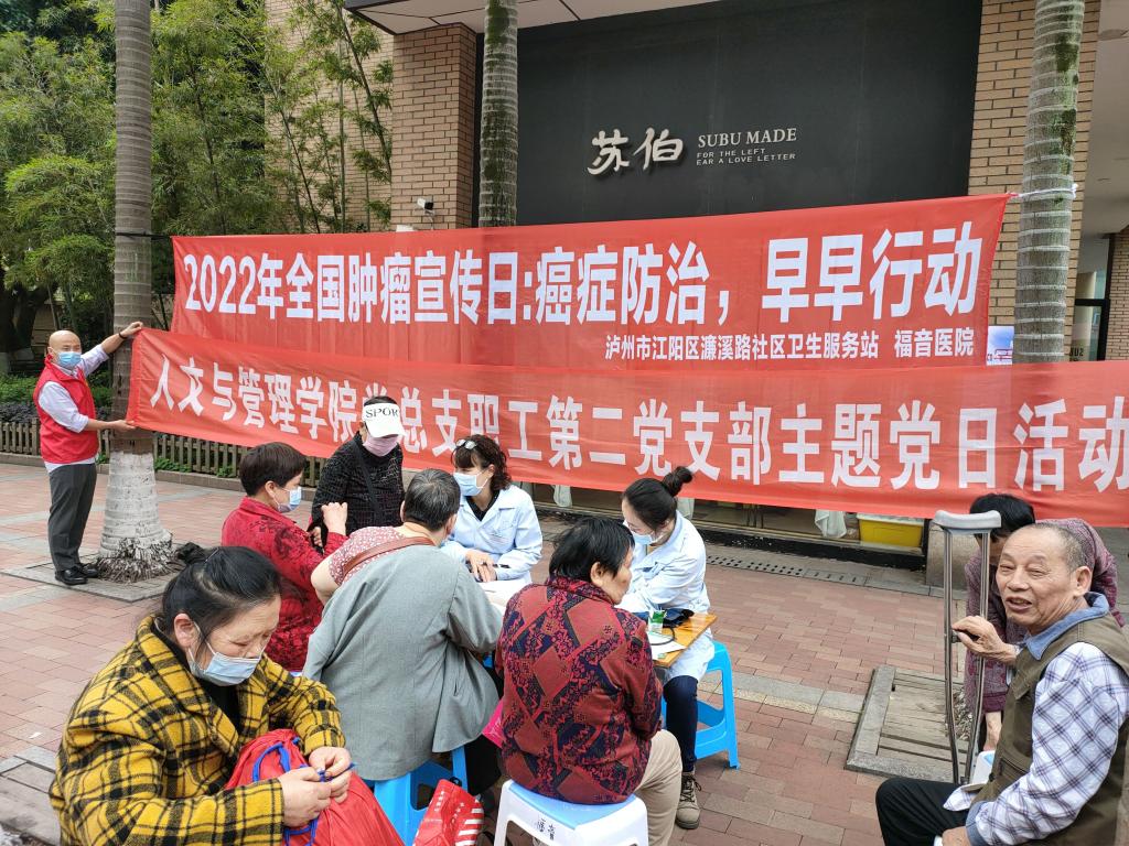 2022年4月19日,西南医科大学人文与管理学院党总支职工第二党支部联合泸州市北城街道社工站与福音医院的医务人员在北城街道濂溪路社区开展了“社工入户聚民心,福音义诊传真情”的系列义诊志愿服务活动。