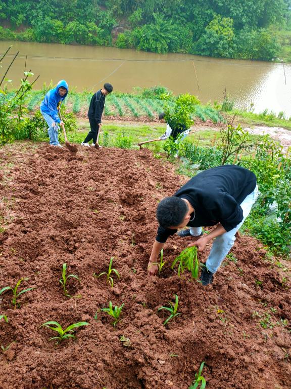 恰逢春雨绵绵纷纷种植作物好时节,在居民朋友的带领下,团队成员深入田间地头感悟春雨播种的农业智慧,帮助居民种植玉米新苗。魏永松、李欢率先进入田园进行松土种植。