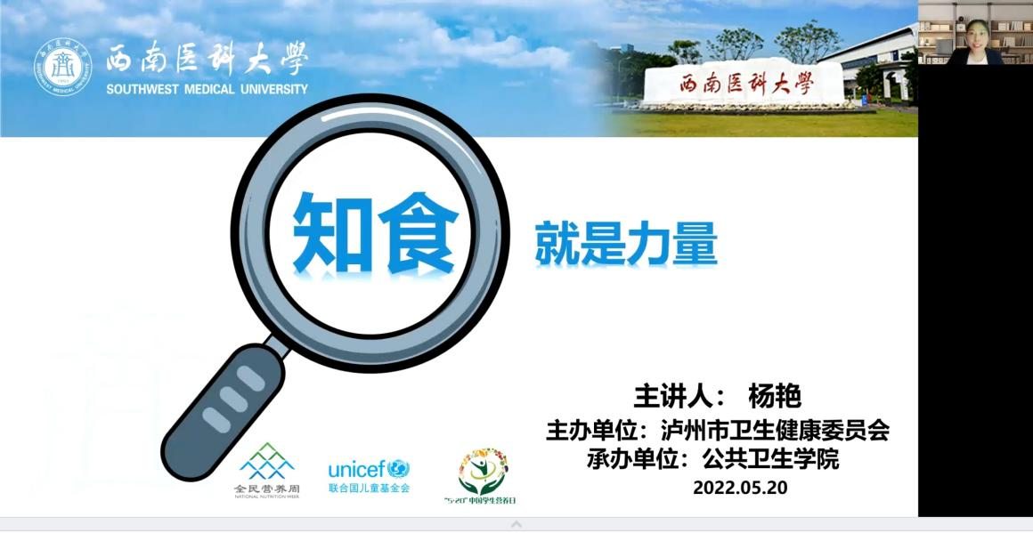为贯彻落实2022年全民营养周暨“5•20”中国学生营养日—“知营养 会运动 防肥胖 促健康”的活动主题,市卫生健康委员会联合西南医科大学公共卫生学院,于5月20日晚,面向泸州市龙马潭区、江阳区公立初中及小学学生与家长,经腾讯会议APP网络研讨会功能,开展了以“知营养 会运动”为主题的线上会议,观看人数达五百余人。
